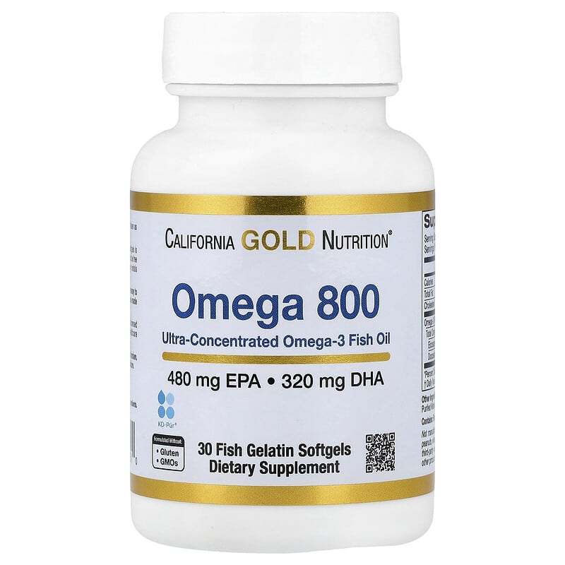 California Gold Nutrition Omega-800 Ultra Concentrated Omega-3 Fish Oil delivers high-potency support for cardiovascular, brain, and joint health. Each softgel provides 1,000 mg of fish oil with 800 mg of omega-3 fatty acids (500 mg EPA and 300 mg DHA) in the natural triglyceride form for optimal absorption. This premium formula is molecularly distilled, purified to remove contaminants, and verified for purity and potency. Ideal for adults seeking concentrated omega-3 benefits without taking multiple capsules daily. Supports healthy inflammatory response, cognitive function, and overall wellness. Made with sustainably sourced fish and manufactured in a cGMP-registered facility. Ingredients: Fish Oil (from anchovies and sardines), Fish Gelatin Softgel (gelatin, glycerin, water). Suggested Use: Take one softgel daily with a meal, or as directed by a healthcare professional. Other Ingredients: None. Warnings: Keep out of reach of children. Store in a cool, dry place. Do not use if seal is broken. Disclaimer: These statements have not been evaluated by the Food and Drug Administration. This product is not intended to diagnose, treat, cure, or prevent any disease. Note: This product is not a medicine and does not replace medication. Please consult your doctor before use. Buy Now at iHerb.